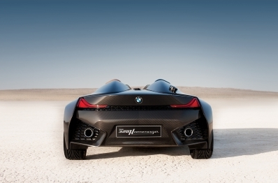 Das Heck greift die Formensprache der Frontgestaltung auf. Analog zur Front bilden Teile der Seitenwand den Rahmen für die scheinbar aus dem Heck ragenden Gestaltungselemente. Dazwischen sitzen weit außen zwei sehr klar und reduziert dargestellte Heckleuchten in der BMW typischen L-Form. Zwei filigrane Leuchtkörper zeichnen eine stark