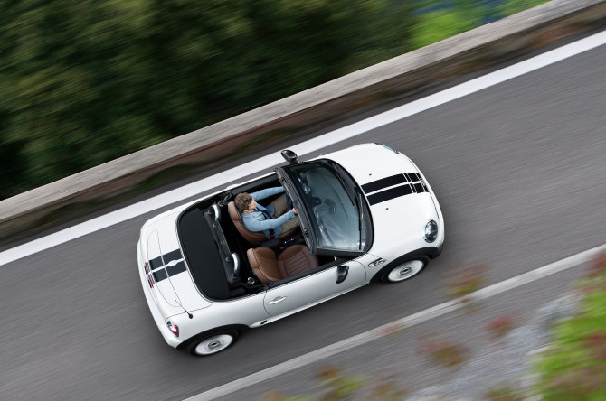 Drei-Box-Design mit markant abgesetztem Kofferraum; elegant gestreckte Roadster-Anmutung durch stark geneigte A-Säulen, kontinuierlich leicht ansteigende Brüstungslinie und flach auslaufendes Heck; Fahrzeughöhe um mehr als 20 Millimeter geringer als beim MINI Cabrio; manuell betätigtes Textilverdeck mit einfachem Mechanismus für spontanes, schnelles Öffnen und Schließen.