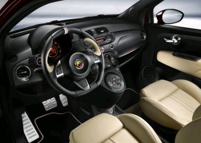 Der Innenraum des neuen Abarth 696 Edizione Maserati spiegelt den Komfort eines klassischen Granturismo wider. Die bequemen und dennoch guten Seitenhalt gebenden Sportsitze sind mit dem für Maserati typischen sandbeigem Leder bezogen. In die integrierten Kopfstützen auf Fahrer- und Beifahrerseite ist die magische Ziffer 695 geprägt, eine Reminiszenz an erfolgreiche Abarth Rennwagen aus den 1960er Jahren. Dieses Logo schmückt auch die Kulisse mit den Wahlknöpfen des Getriebes sowie Einsätze in der Armaturentafel, die aus matt schimmerndem Sichtcarbon gefertigt sind. Das Lederlenkrad weist einen schwarzen Kranz mit Einsätzen aus dem gleichen sandbeigen Leder wie die Sitze auf. Pedale und die Stütze für den linken Fuß des Fahrers sind aus Aluminium gefertigt.