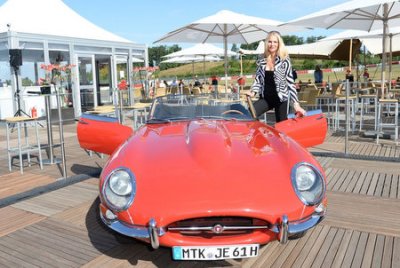 | Moderatorin Sonya Kraus mit dem Jaguar E-TYPE |