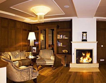 | Restaurant im Tiroler Stil (unten), offener Kamin neben der Bar (oben) |