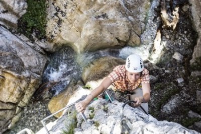 Klettersteigset und Helme bringen die Bergführer mit, falls Sie einen Klettersteig gehen wollen. Der Klettersteig ist kein absoluter „Einsteiger-Klettersteig“, aber auch nicht allzu schwierig. Er wird als „Familien-Klettersteig“ bezeichnet.