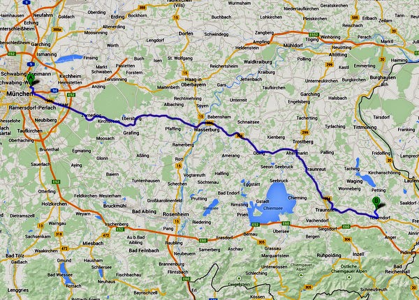 Gemütlich im Cabrio: B304 München – Ebersberg – Wasserburg am Inn – Altenmark – Traunreut – Traunstein – Teissendorf.