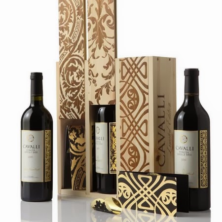 Das Kleid, sprich das Etikett der Cavalli Tenuta degli Dei, präsentiert sich bei den Jahrgängen 2004 – 2007 an den Seiten mit zwei schmalen Streifen, die, wie in der Modewelt üblich, Jahr für Jahr wechseln und deren Muster von Stoff-Designs aus dem „Maison Cavalli“ stammen.