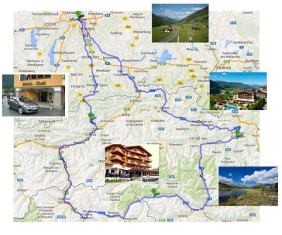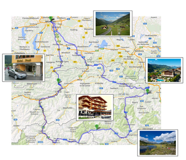 Tourenverlauf: München – Tegernsee – Achensee – Perisau – B171 durch das Inntal – Brenner Strasse – Brenner See – Sterzing – SS49 durch das Pustertal – Bruneck – Antholzer See – Staller Sattel – Defereggental – St. Jakob – Lienz – Heiligenblut – Großglockner Hochalpenstraße – St. Johann im Pongau – Alpendorf – Hochkönig Bundesstraße – Maria Alm am Steinernen Meer – Fieberbrunn – Kufstein – München