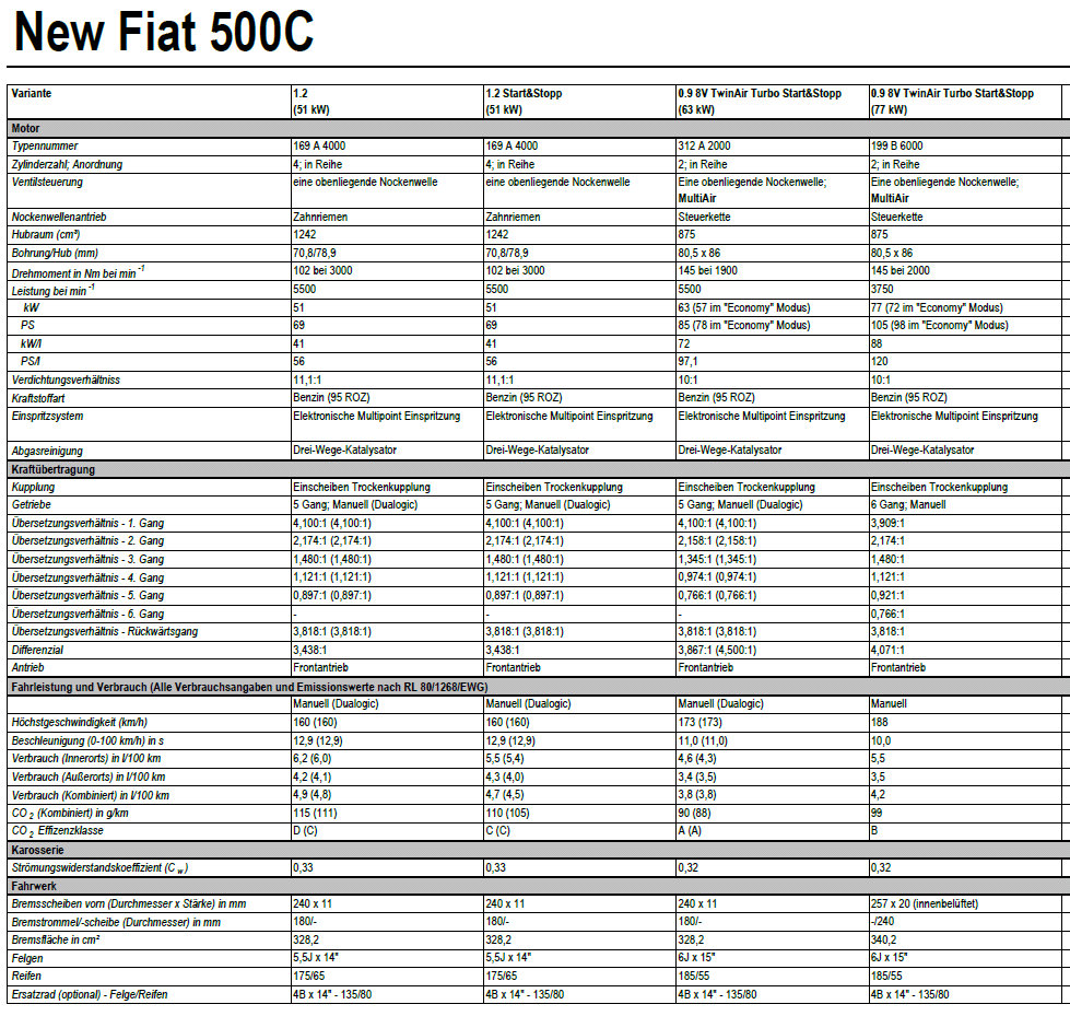 Fiat 500C mit 1.2 8V Motor (69 PS)