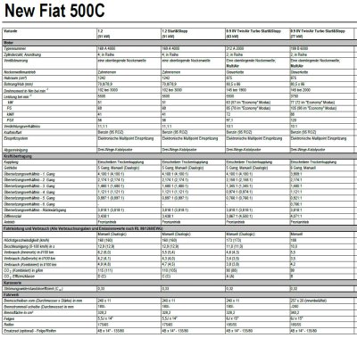 Die Motorenpalette des neuen Fiat 500 besteht zum Markstart aus dem Zweizylinder-Benziner TwinAir mit 63 kW/85 PS oder 77 kW/105 PS und dem Vierzylinder-Benziner 1.2 8V mit 51 kW/ 69 PS. Speziell der TwinAir Motor ist vorbildlich, was seine Umweltfreundlichkeit angeht. Der Co2-Wert beträgt je nach Leistungsvariante nur 90 beziehungsweise 99 Gramm pro Kilometer Fahrt, alle drei Motoren schaffen die Euro-6-Norm. Ein Diesel soll später kommen.