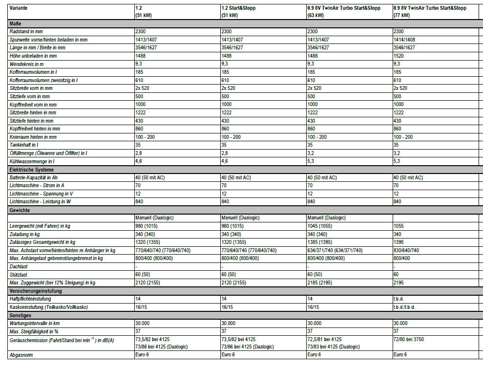 Beide Karosserieversionen, die Limousine und Cabriolet, werden in drei Ausstattungsvarianten angeboten. Schon in der Basisausstattung Pop sind unter anderem sieben Airbags, Tagfahrlicht in Led-Technik sowie ein Multimediasystem mit Fünf-Zoll-Bildschirm, sechs Lautsprechern, Anschlüssen für externe Musikspeicher oder Smartphones und Multifunktionstasten am Lenkrad serienmäßig an Bord.