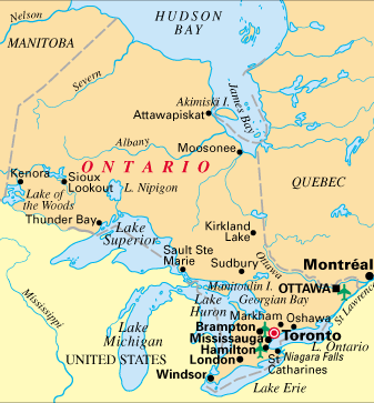 Fläche:1.068.582 qkm, Bevölkerungszahl 12.929.000 (2008), Hauptstadt ist Toronto mit 4.977.164 Einwohner. Ontario grenzt im Westen an Manitoba und im Osten an Québec. Im Norden liegt die Hudson Bay. Die Ufer der großen Seen im Süden bilden die Grenze zu den USA. Der größte Teil der Bevölkerung lebt in der Umgebung von Toronto und Ottawa im Süden der Provinz. Im Norden herrschen Wald- und Seengebiete vor. Die berühmten Niagara-Fälle liegen im Südosten dieser Gegend. Sprache überwiegend Englisch.