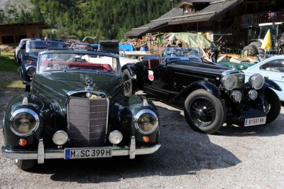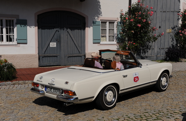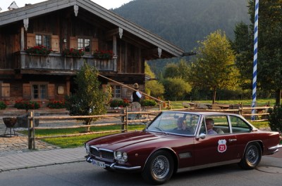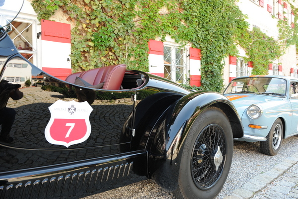 Auch die Rosenheimer Firma Premium Cars begleitete die Oldtimerfahrt hilfreich mit einem Ersatzfahrzeug, wenngleich neuestem Datums, einem schwarzen Jaguar F-Type mit beeindruckenden 380 PS. Unter den kostbaren Boliden waren auch ein alter Bentley Alpin Roadster Baujahr 1951, dazu ein weinroter Maserati Mexiko 1972, der unterwegs respekteinflößende Überholmanöver demonstrierte, ein schicker dunkelgrüner Alfa Romeo, ein liebevoll gepflegter Karmann Ghia, bis hin zu einem schwarzen Morgan Plus 8, der den richtigen Motoren-Sound beisteuerte.