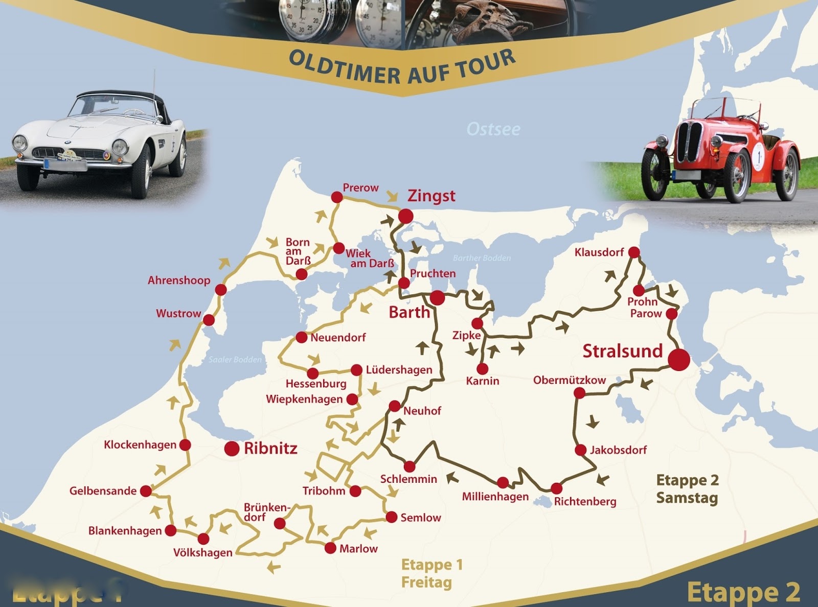 Die erste Etappe führt um den Saaler Bodden über Pruchten, Marlow, Gelbensande und Ahrenshoop. Am zweiten Tag geht es über Barth nach Stralsund und anschließend über Richtenberg und Schlemmin zurück auf die Halbinsel.