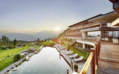 Hoch über Meran liegt das Hotel in Hafling, wo kein Hügel und kein Wald die Aussicht auf die Alpen stört. Die riesige Gartenanlage pflegen der Hausherr und sein Junior höchst persönlich mit Südtirols längsten beheizten Naturbadeteich und einen Infinity-Pool. Außerdem immer wieder Nischen zum Entspannen, gemütliche Liegen, eine Schaukel für zwei mit Blick Richtung Gebirge.