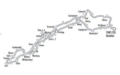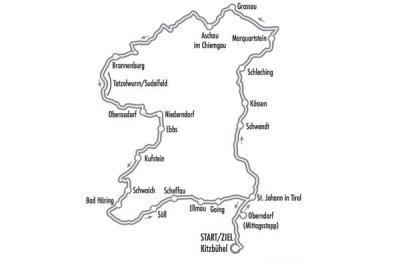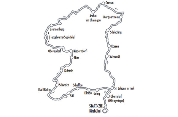 „Brandenberg-Runde“ mit Kitzbühel – Hopfgarten – Niederau – Wörgl – Rattenberg – Brandenberg – Kramsach – Reintalersee – Breitenbach – Mariastein – Kufstein – Ebbs – Walchsee – Bichlach/Kössen – Schwendt – Kirchdorf – St. Johann in Tirol – Ellmau (Dorfzentrum) – Sperten – Oberndorf Penzinghof (Mittagsstopp) – Kitzbühel.