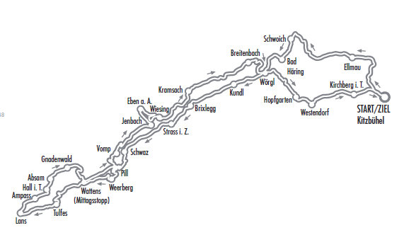 Kitzbühel (Hahnenkammparkplatz)– Mittersill – Gerlos – Zell am Ziller – Stumm – Reith i.A. – Hart – Bruck – Jenbach – Eben – Pertisau (Mittagsstopp) – Wiesing – Kramsach – Niederbreitenbach – Kirchbichl – Bad Häring – Bruckhäusl – Hopfgarten – Westendorf – Kitzbühel Zentrum