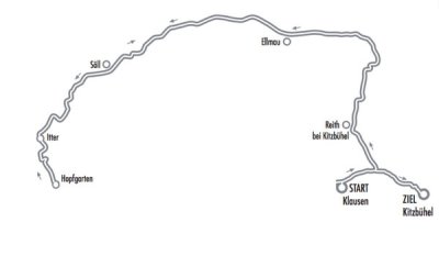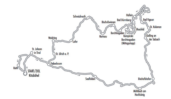 Kitzbühel – Pass Thurn – Mittersill – Kaprun – St. Johann/P. – Bischofshofen – Mühlbach – Saalfelden – Brandlhof (Mittagsstopp) – Lofer – Schneitzlreuth – Reit im Winkl – Kirchdorf – St. Johann in Tirol – Oberndorf in Tirol – Reith bei Kitzbühel – Kitzbühel (Zentrum)