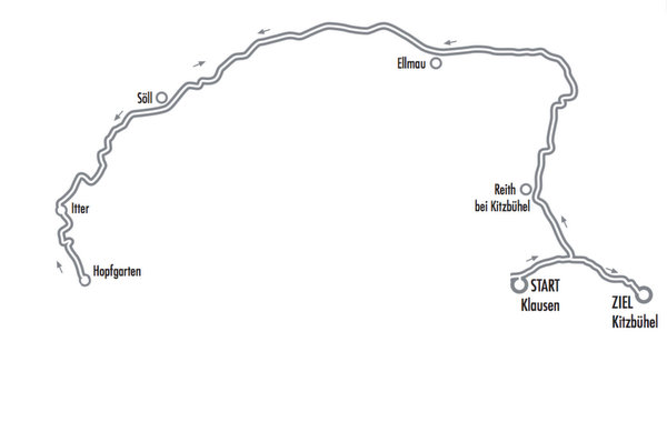 Start: Parkplatz Fleckalmbahn Kirchberg – St. Johann in Tirol – Going am Wilden Kaiser – Ellmau – Oberndorf in Tirol – Reith bei Kitzbühel – Ziel Kitzbühel/Vorderstadt
