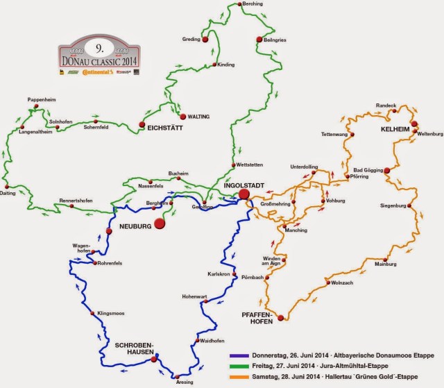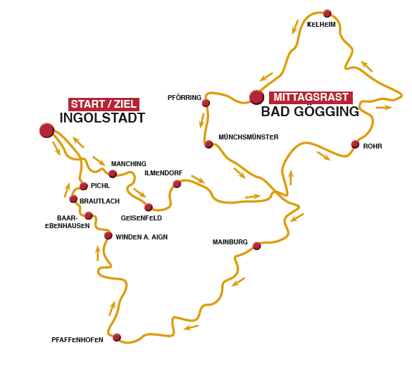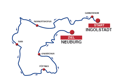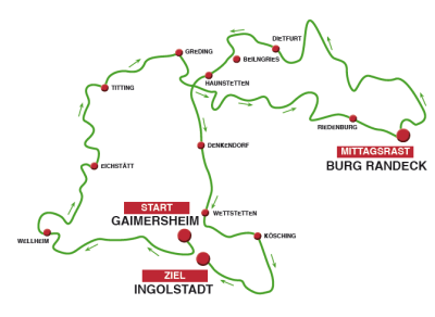 Ingolstadt (Continental, Start) – Wellheim – Dollnstein – Eichstätt – Walting (Mittagsrast Gut Moierhof) – Eichstätt – Kipfenberg – Berching – Kinding – Greding – Gaimersheim – Neuburg a. d. Donau (Ziel)