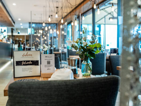 Zeitgenössisch luftig ist das Restaurant „Dahoim“, welches in verschiedenen Räumen Platz für bis zu 280 Gäste bietet. Mit seinen Designer-Lampen, antiken Deckenbalken und riesigem offenen Kamin aus dem Jahre 1648verbindet es gekonnt Tradition und Moderne.