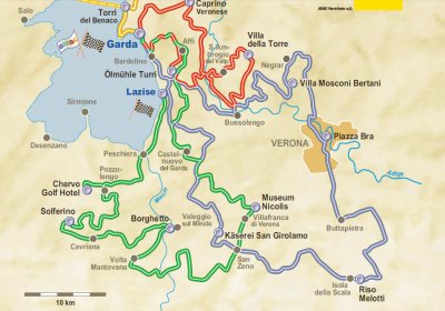 Die täglichen Basistouren betrugen zwischen 120 und 180 km. Die Routen und Wanderpausen waren komplett ausgeschildert. Oldtimerwandern mit dem ADAC Nordrhein bedeutete für die Teilnehmer: Die Landschaft und die Sehenswürdigkeiten stets stressfrei, entspannt, ohne Zeitdruck und ohne Orientierungsprobleme zu genießen. Alle Starts zu den Tagesetappen erfolgten von der Ortschaft Garda in Venetien aus.