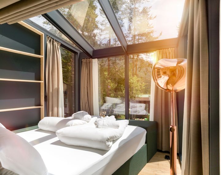 Herzstück ist das Doppelbett im Glas Cube mit freiem Blick in den Himmel und in die Natur. Wer abends die Spezialvorhänge der Decke öffnet, kann bei klarer Sicht den Sternenhimmel mit der Milchstraße sehen.