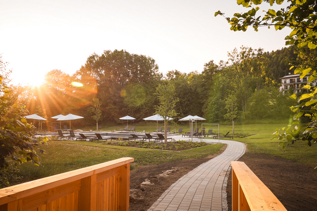 Die 20.000 m² große Gartenanlage mit idyllischem Bachlauf , saftigen Liegewiesen , Barfußpfadweg und Naturkneippbecken begeistert Jung und Alt, der Kinderspielplatz mit Streichelzoo ist ein Highlight für die kleinen Urlaubsgäste.