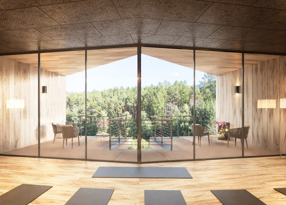 Der Spa schmiegt sich in seiner kubistischen Bauweise sanft an den See, dazu gibt es eine finnische Panorama-Sauna mit Direktzugang zum privaten Natursee in einem weitläufigen Garten und Beauty- und Ruhezonen, um einfach nur zu faulenzen. Neben dem römischen Dampfbad und einer Bio-Sauna gefällt der beheizte Infinitypool, der von innen nach draußen führt, Panoramablick auf die Berge inklusive.
