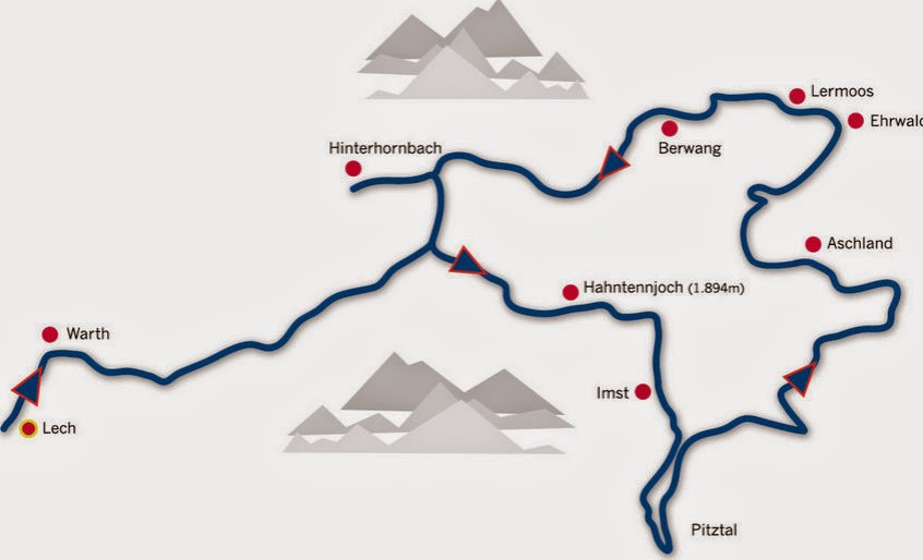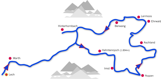 Die Strecke führt zunächst durch den bereits bekannten Lech Canyon und dem Lechtal hinauf zum traditionellen Hahntennjoch. Nachdem der erste Pass erklommen ist, heißt Imst die Teilnehmer im Inntal willkommen.
