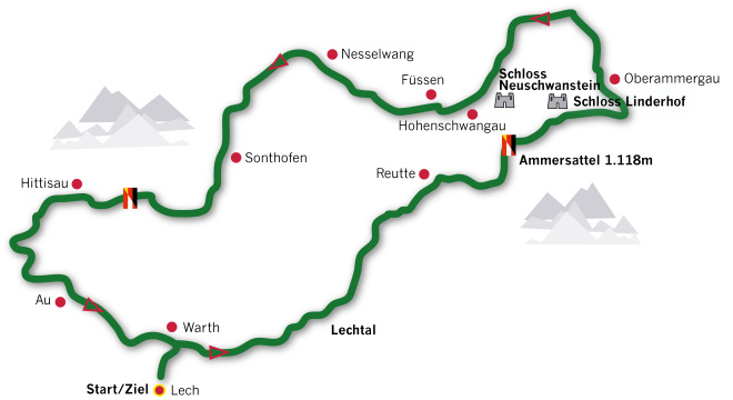 Lech – Warth – Steeg – Reutte – Ammerwald – Schloss Linderhof – Mühle – Ettal – Oberammergau – Wildsteig – Schloss Neuschwanstein – Hohenschwangau – Weißensee – Nesselwang – Gschwend – Oberzollhaus – Kranzegg – Hittisau – Warth – Lech