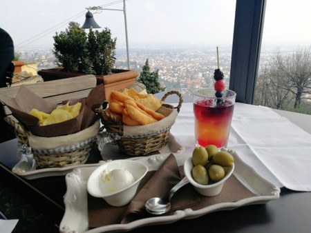 Schon während der gemächlich verlaufenden Fahrt kann man den Blick entspannt hinunter in die Unterstadt und weiter in die Poebene schweifen lassen. Dass man umgehend nach der Ankunft einer Stärkung bedarf, dazu verführt leicht schon die atemberaubende Lage der Restaurant-Terrasse des „Baretto“ gleich neben dem Halt der Funicolare.