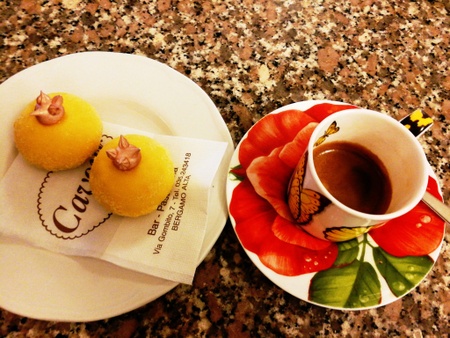 Eine Genusspause sollte man unbedingt im Caffé Cavour 1880 einlegen. In den Vitrinen des stimmungsvollen Traditionscafés lockt inmitten vieler anderer Leckereien die bekannteste von Bergamos Süßigkeiten – und das in Mini-Form: die Polenta e Osei.