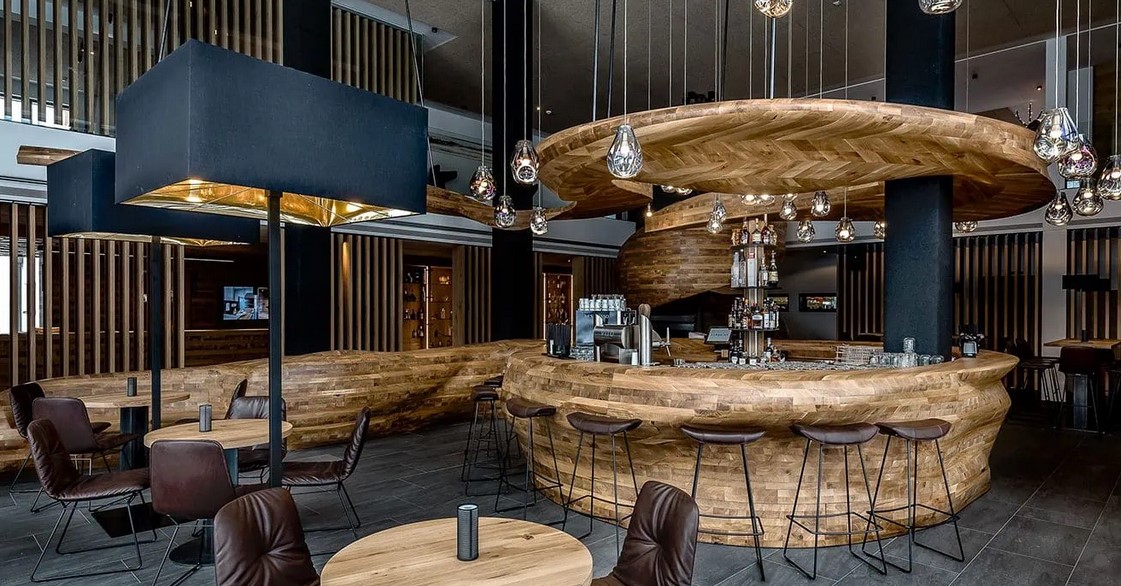 Die Bar & Lounge „Freiraum“ setzt international Maßstäbe. Aus 16.000 Eichenholzwürfel lässt wurde ein durchgehendes Sitzmöbel bauen, in dem Lounge, Bar, Kunstobjekt und Wendeltreppe ineinander verschmelzen. Über 4,5 Meter hoch und 40 Meter lang ist das aufsehenerregende Objekt.