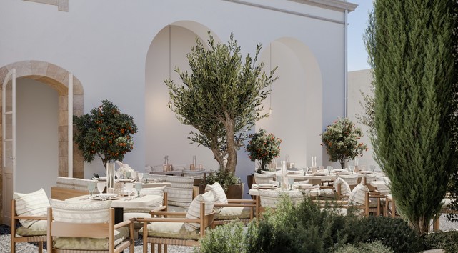 Zentrum des Hotels ist der ruhige Innenhof mit einem kleinen Restaurant und einer stilvollen Bar. Kulinarisch erwartet Gäste eine moderne Interpretation mediterraner Küche mit saisonalen, regionalen Bio-Zutaten.